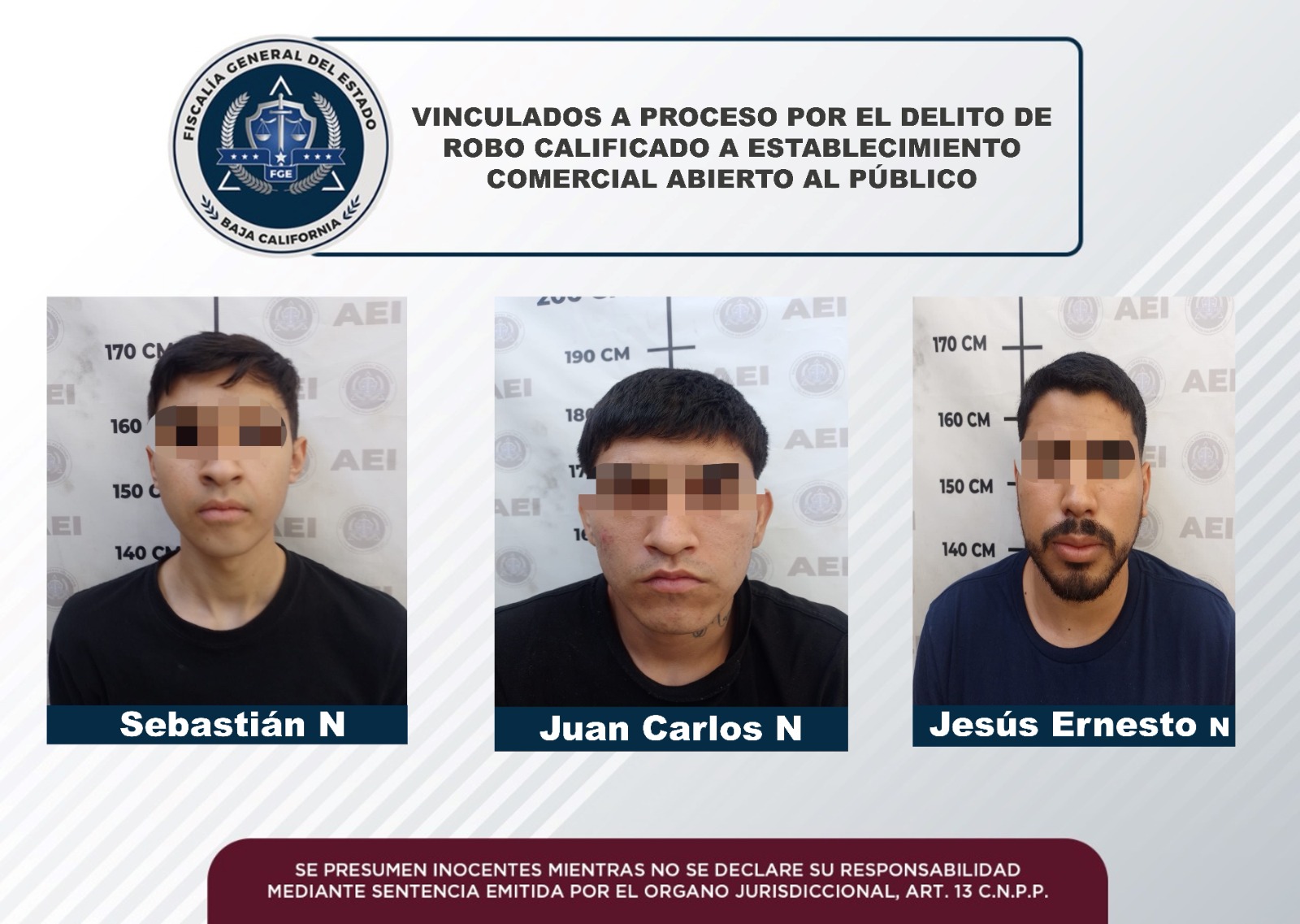 MEXICALI, B.C. La Fiscalía Regional de Mexicali, a través del trabajo realizado por la Unidad de Investigación con Detenidos Poniente, obtuvo la vinculación a proceso en contra de Jesús Ernesto “N”, Sebastián “N” y Juan Carlos “N”, por presuntamente cometer el delito de robo a establecimiento comercial, abierto al público.