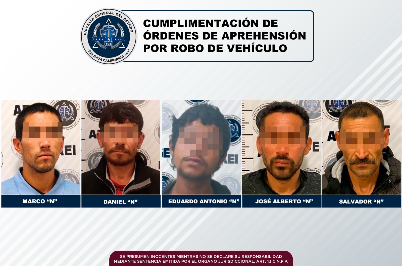 TIJUANA, B.C. Cinco hombres fueron aprehendidos por elementos de la Agencia Estatal de Investigación de la Fiscalía General del Estado, en razón de que en casos distintos están presuntamente relacionados al delito de robo de vehículo.