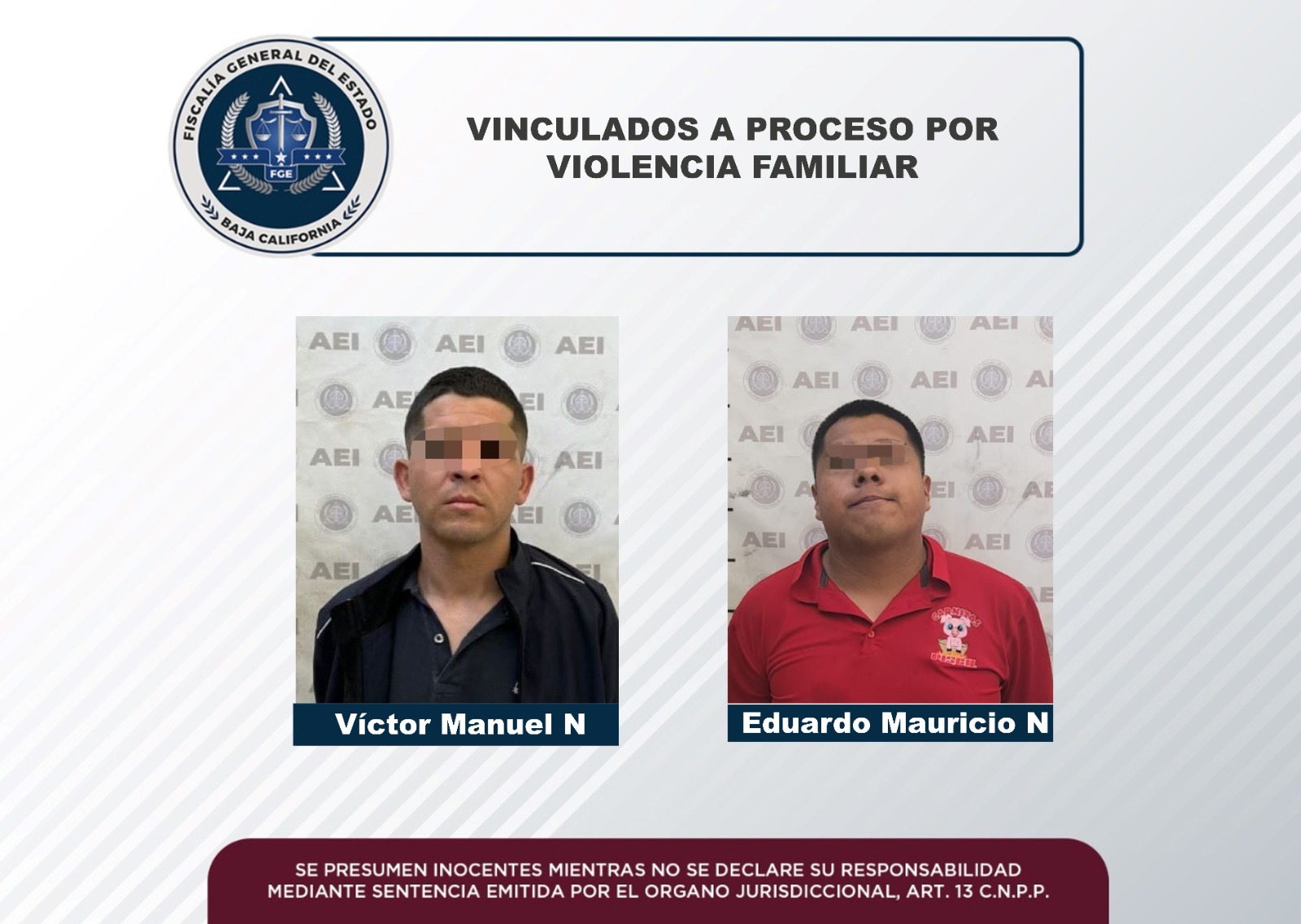 MEXICALI, B.C. Mediante el trabajo desempeñado en la integración de la carpeta de investigación, la Fiscalía Especializada en Delitos Contra Mujeres por Razón de Género, en audiencias por separado, obtuvo la vinculación a proceso en contra de dos sujetos por presuntamente cometer el delito de violencia familiar.