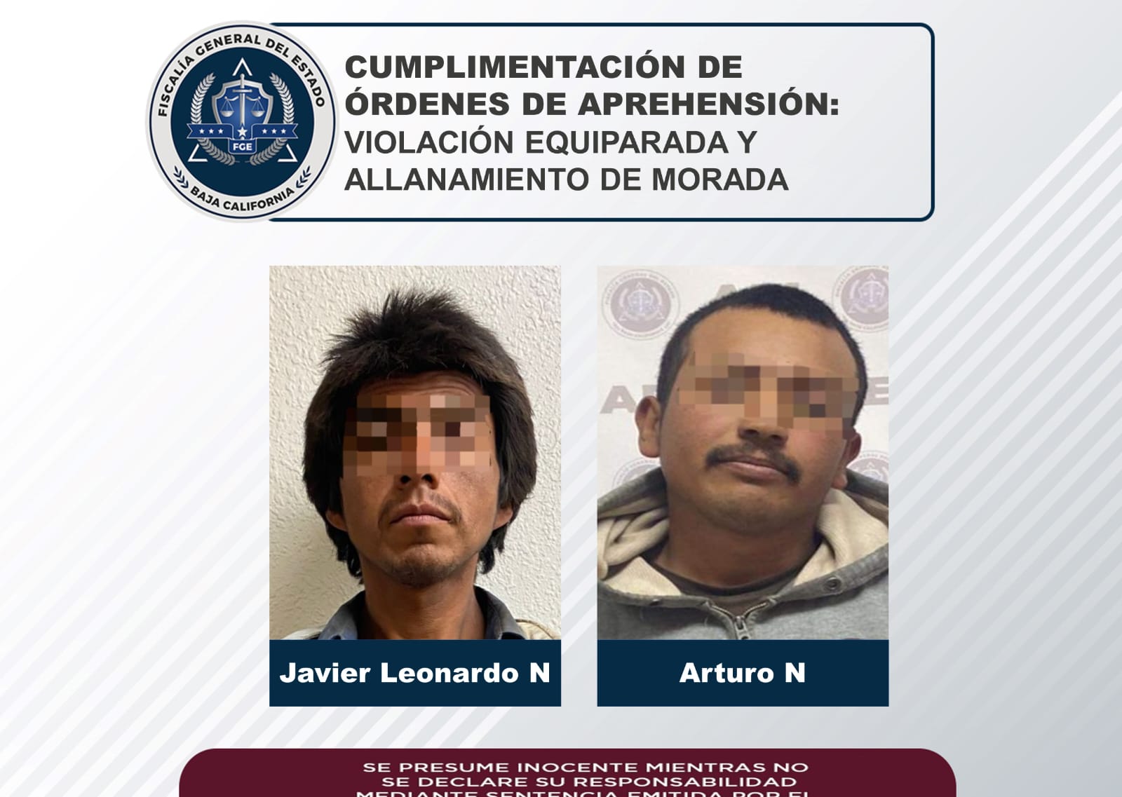 Agentes de la FGE cumplimentan dos órdenes de aprehensión por violación equiparada y allanamiento de morada, en San Quintín