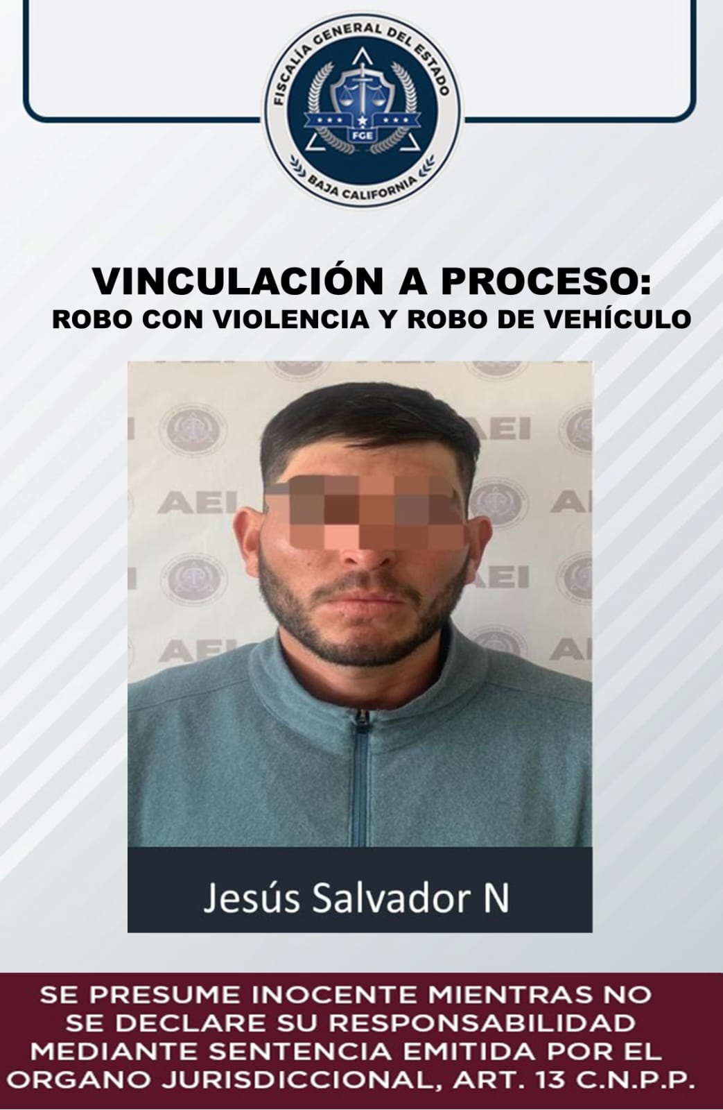 ENSENADA, B.C. Por el delito de robo calificado ejecutado con violencia y robo de vehículo, la Fiscalía Regional del puerto logró reclusión preventiva contra Jesús Salvador “N”.