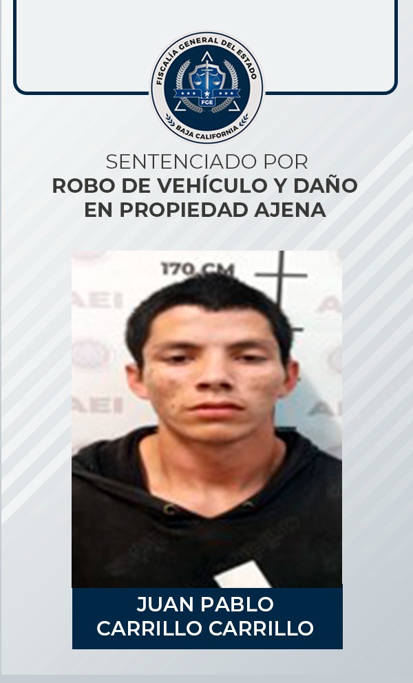 TIJUANA, B.C. Datos de prueba presentados por el Ministerio Público de la Fiscalía Regional de Tijuana, permitieron la obtención de una sentencia para Juan Pablo Carrillo Carrillo, responsable penalmente de los delitos de robo equiparado de vehículo de motor en su modalidad de usar vehículo de motor robado y daño en propiedad ajena.