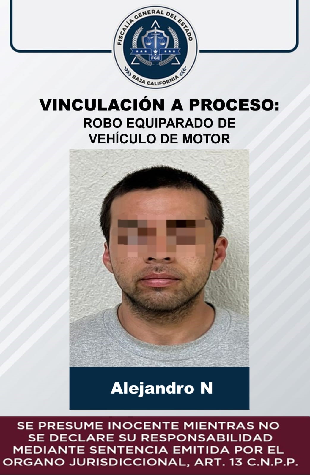 SAN QUINTÍN, B.C.- Datos de prueba expuestos por el Ministerio Público permitieron que un Juez de Control vinculara a proceso a Alejandro “N”, tras ser encontrado en posesión de un vehículo robado.