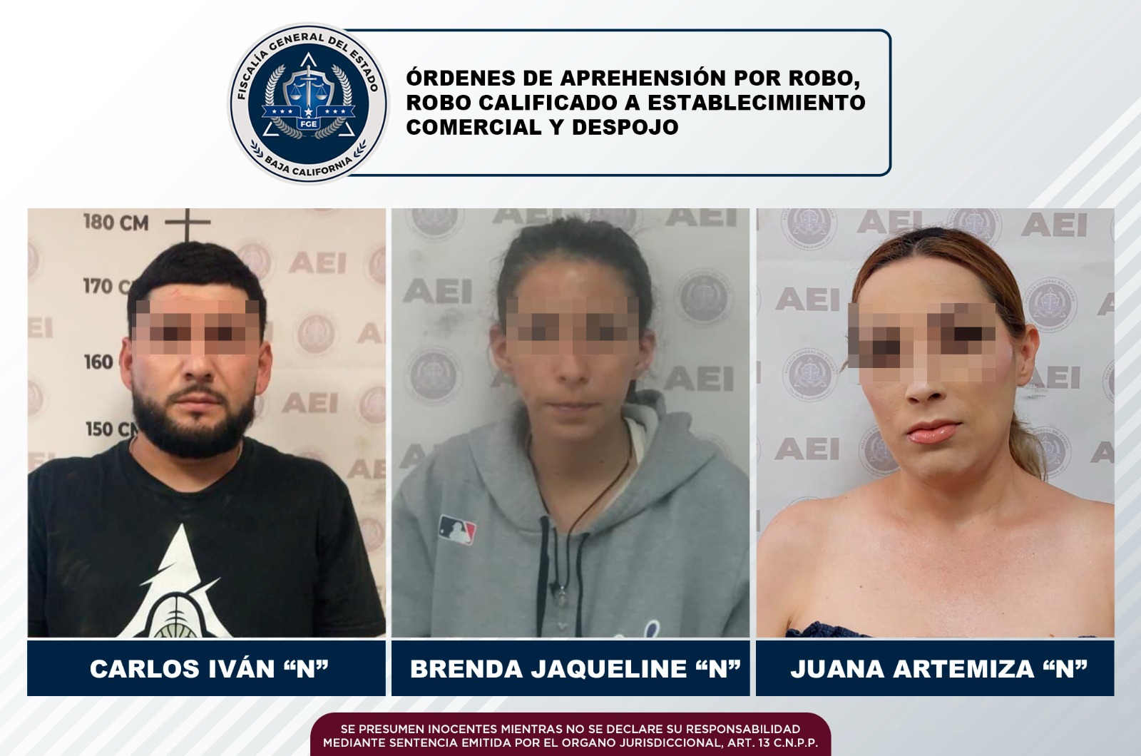 TECATE, B.C. La Fiscalía General del Estado, a través de los elementos de la Agencia Estatal de Investigación, cumplimentó tres órdenes de aprehensión por los delitos de robo, robo calificado a establecimiento comercial abierto al público cometido por dos o más personas armadas y despojo.