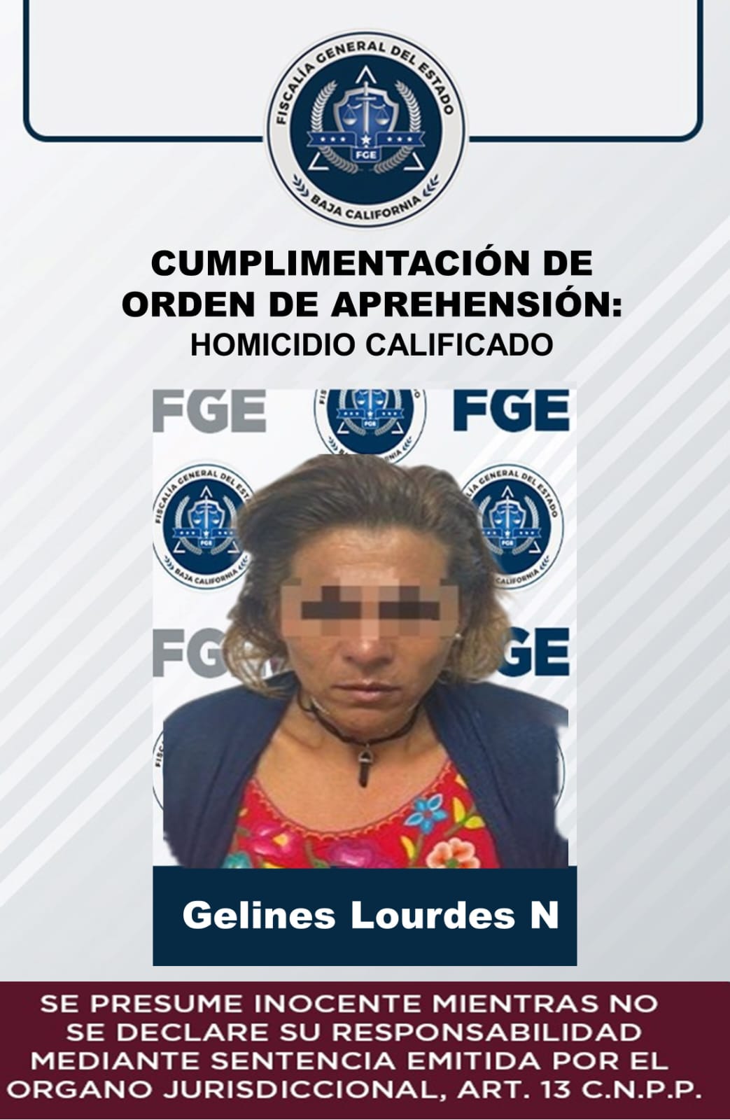 ENSENADA, B.C. La Fiscalía General de Baja California, obtuvo y cumplimentó una orden judicial en contra de Gelines Lourdes “N”, quien se presume habría participado en el asesinato de una persona, tras accionar un arma de fuego.