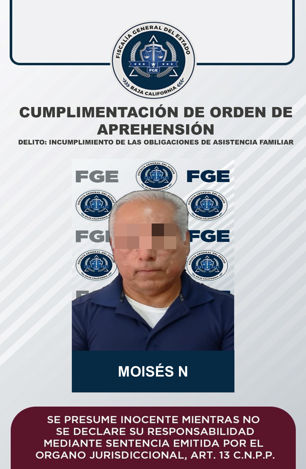 ENSENADA, B.C. La Fiscalía General del Estado, a través de elementos de la Agencia Estatal de Investigación, cumplimentó una orden de aprehensión a Moisés “N”, por el delito de incumplimiento de las obligaciones de asistencia familiar.