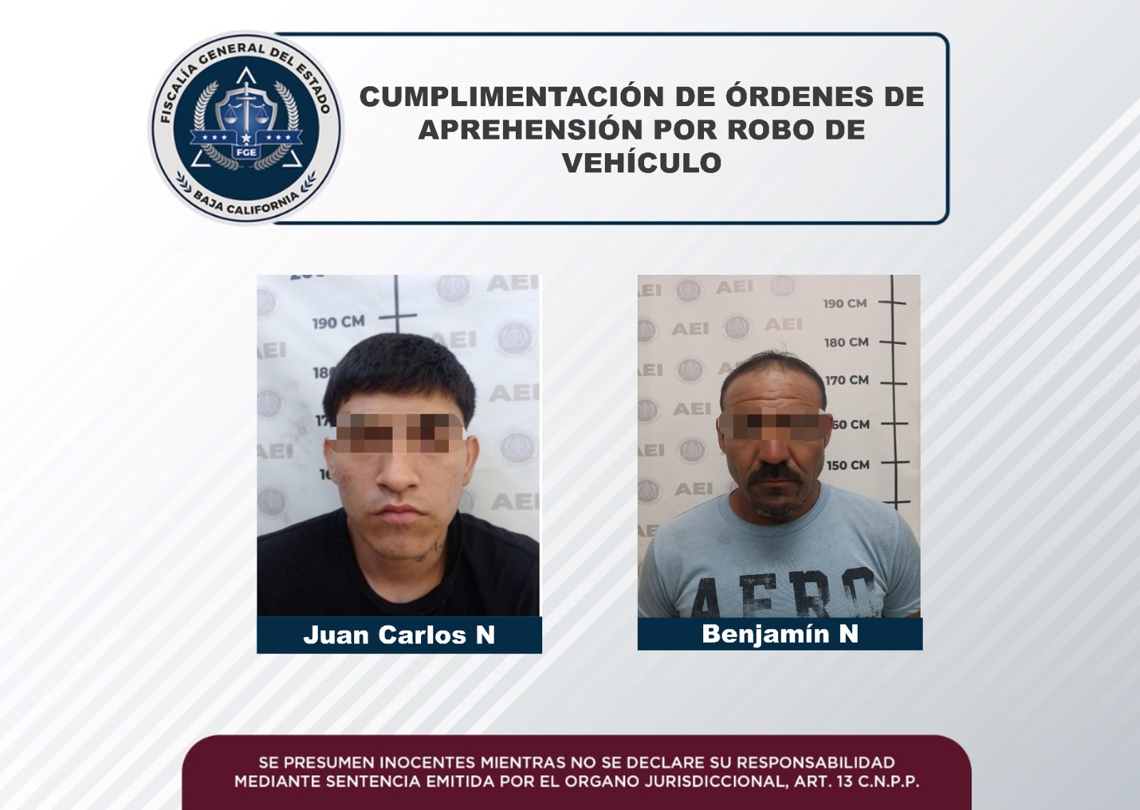 MEXICALI, B.C. Agentes estatales de investigación, adscritos a la Fiscalía Regional de Mexicali, cumplimentaron órdenes de aprehensión en contra de dos sujetos por el delito de robo de vehículo.