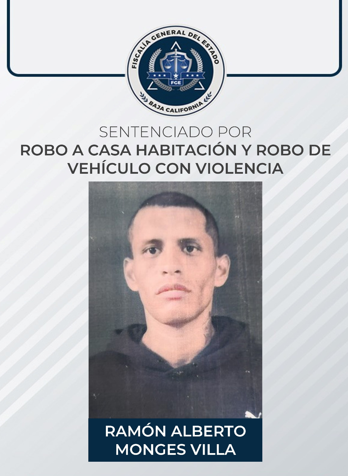 TIJUANA, B.C. La Fiscalía Regional de Tijuana acreditó la responsabilidad de Ramón Alberto Monges Villa en los delitos de robo calificado a casa habitación ejecutado con violencia y robo de vehículo con violencia.