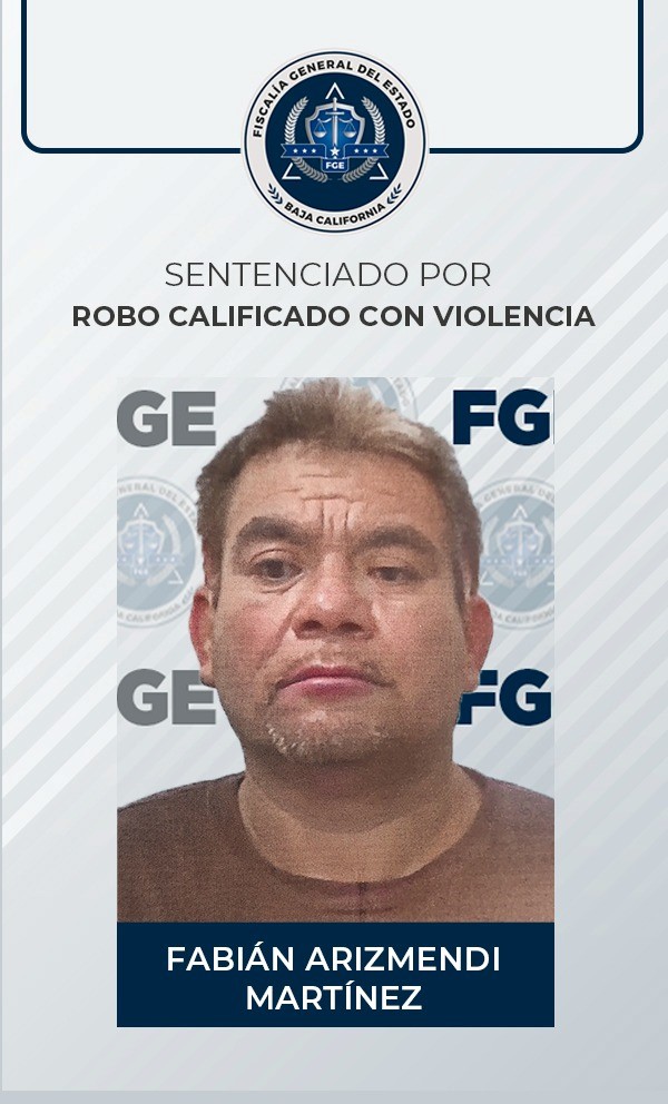 TIJUANA, B.C. En procedimiento abreviado, la Fiscalía General del Estado (FGE), a través de la Fiscalía Regional de Tijuana, obtuvo sentencia de 4 años de prisión en contra de Fabián Arizmendi Martínez por ser responsable penalmente del delito de robo calificado cometido por persona armada ejecutado con violencia, en un hecho ocurrido en el año 2022.