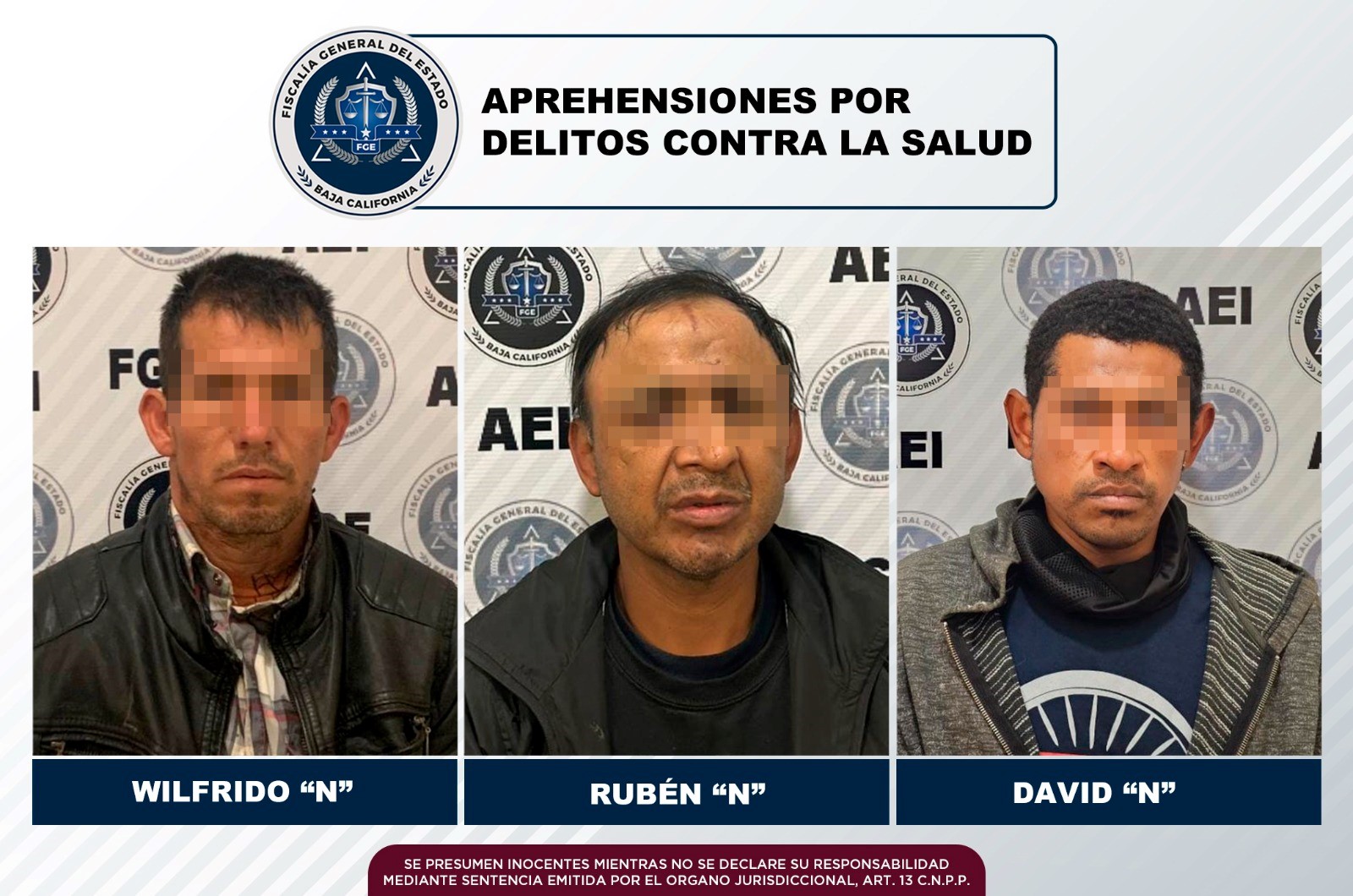 TIJUANA, B.C. Elementos de la Fiscalía General del Estado, adscritos a la Agencia Estatal de Investigación (AEI), cumplimentaron orden de aprehensión a tres hombres, que, en casos distintos, están presuntamente relacionados en delitos contra la salud.