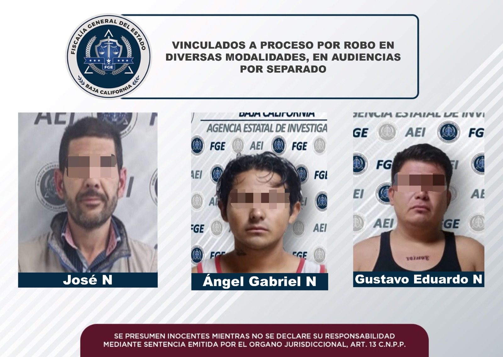 MEXICALI, B.C. La Fiscalía Regional de Mexicali, a través del trabajo realizado por el Ministerio Público, obtuvo la vinculación a proceso de tres sujetos, señalados de robo en diversas modalidades.