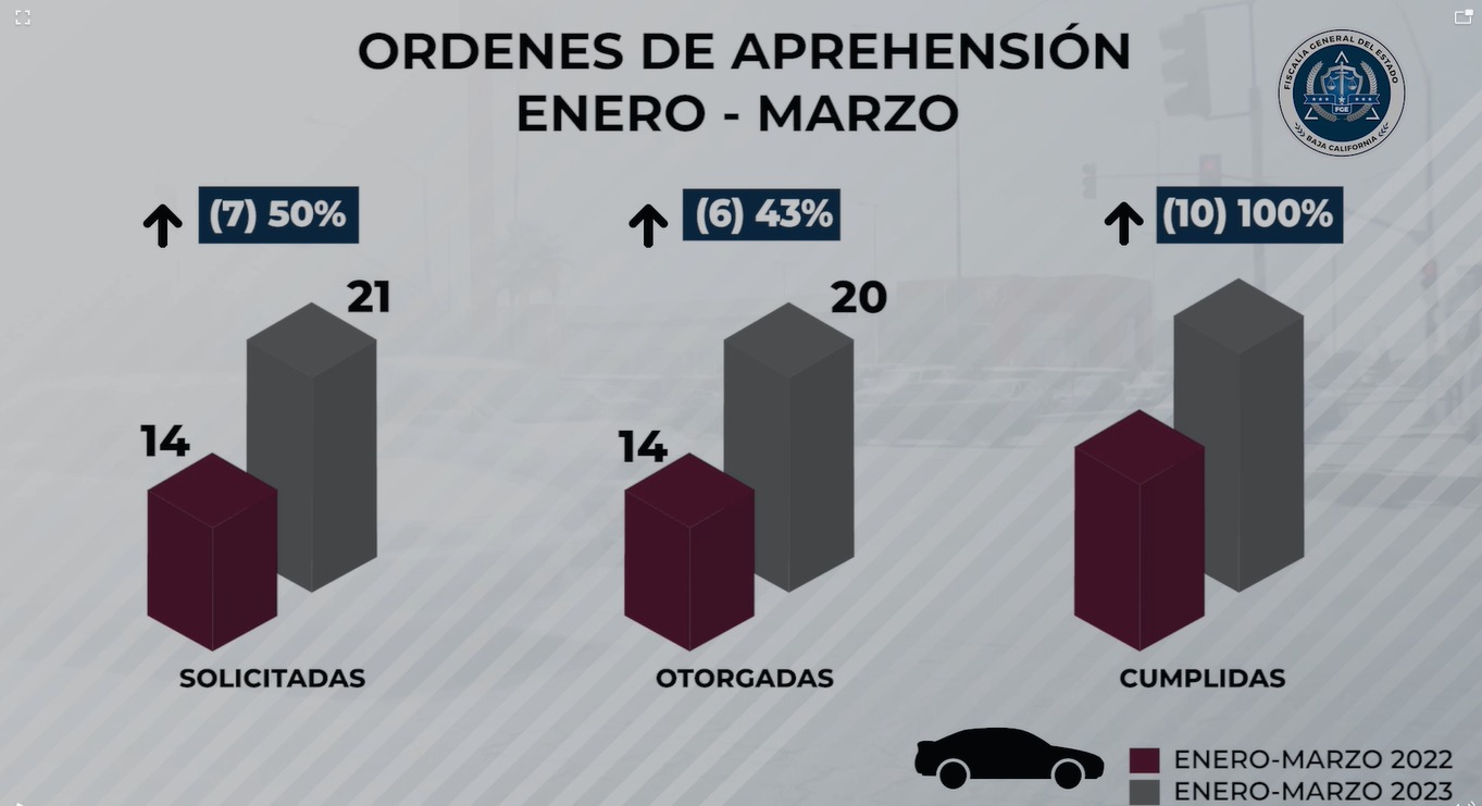 En cuanto a órdenes de aprehensión, se solicitaron 21 en el primer trimestre del año en curso, de la cuales, se otorgaron y cumplimentaron 20; el año pasado se reportaron cifras menores, siendo14 mandamientos judiciales solicitados, 14 otorgados y 10 cumplimentados.