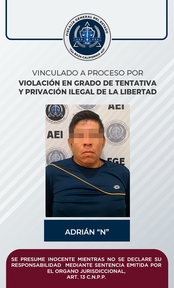 TIJUANA, B.C. Garantizar justicia a las mujeres víctimas de algún delito y desarrollar investigaciones sólidas que permitan aplicar todo el rigor de la ley a quienes atenten contra su integridad, es propósito de Fiscalía General del Estado (FGE), en este sentido, mediante datos de prueba, fue posible obtener, por parte de la autoridad juzgadora, la vinculación a proceso de Adrián "N", presunto responsable de los delitos de violación en grado de tentativa y privación ilegal de la libertad agravada.
