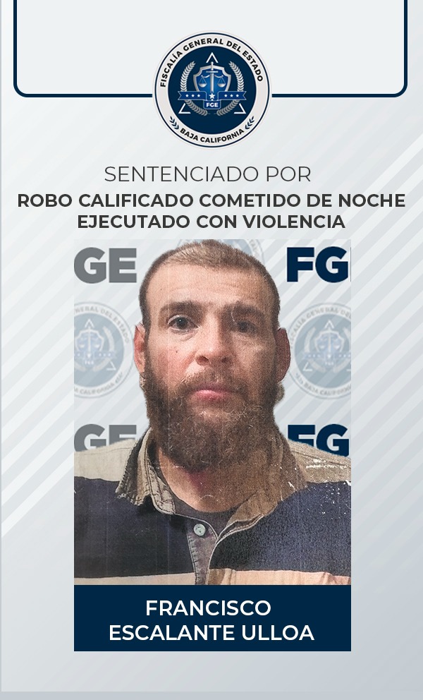 TIJUANA, B.C. La Fiscalía Regional de Tijuana obtuvo, mediante procedimiento abreviado, una sentencia de cuatro años de prisión en contra de Francisco Escalante Ulloa, por su responsabilidad en el delito de robo calificado cometido de noche ejecutado con violencia.