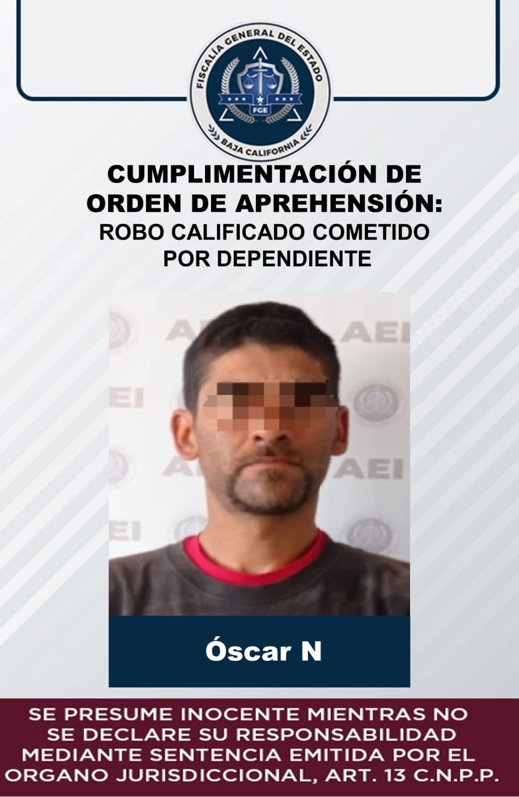ENSENADA, B.C. Agentes de la Fiscalía General del Estado cumplimentaron una orden de aprehensión contra Óscar “N”, por el delito de robo calificado, presuntamente, cometido en una negociación donde trabajaba.