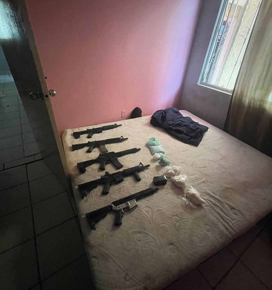 En el cateo, realizado en la avenida Los Ángeles de la colonia Buena Vista, no se encontraron moradores, en cambio, en el domicilio se localizaron cinco armas de fuego largas, tres de ellas sin cargador, y las otras dos con cargadores desabastecidos.