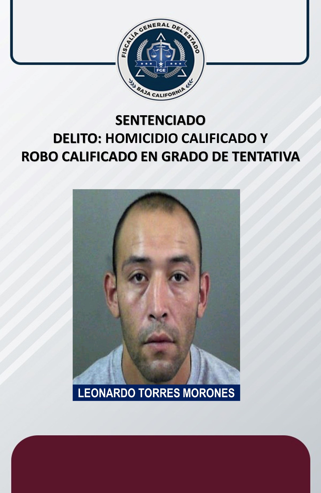 MEXICALI, B.C. Con base a los datos y elementos de prueba aportados por la Fiscalía General del Estado (FGE) a través de la Fiscalía Especializada en de Delitos Contra la Vida, se logró una sentencia condenatoria en contra de Leonado Torres Morones, por los delitos de homicidio calificado y robo con violencia en grado de tentativa.
