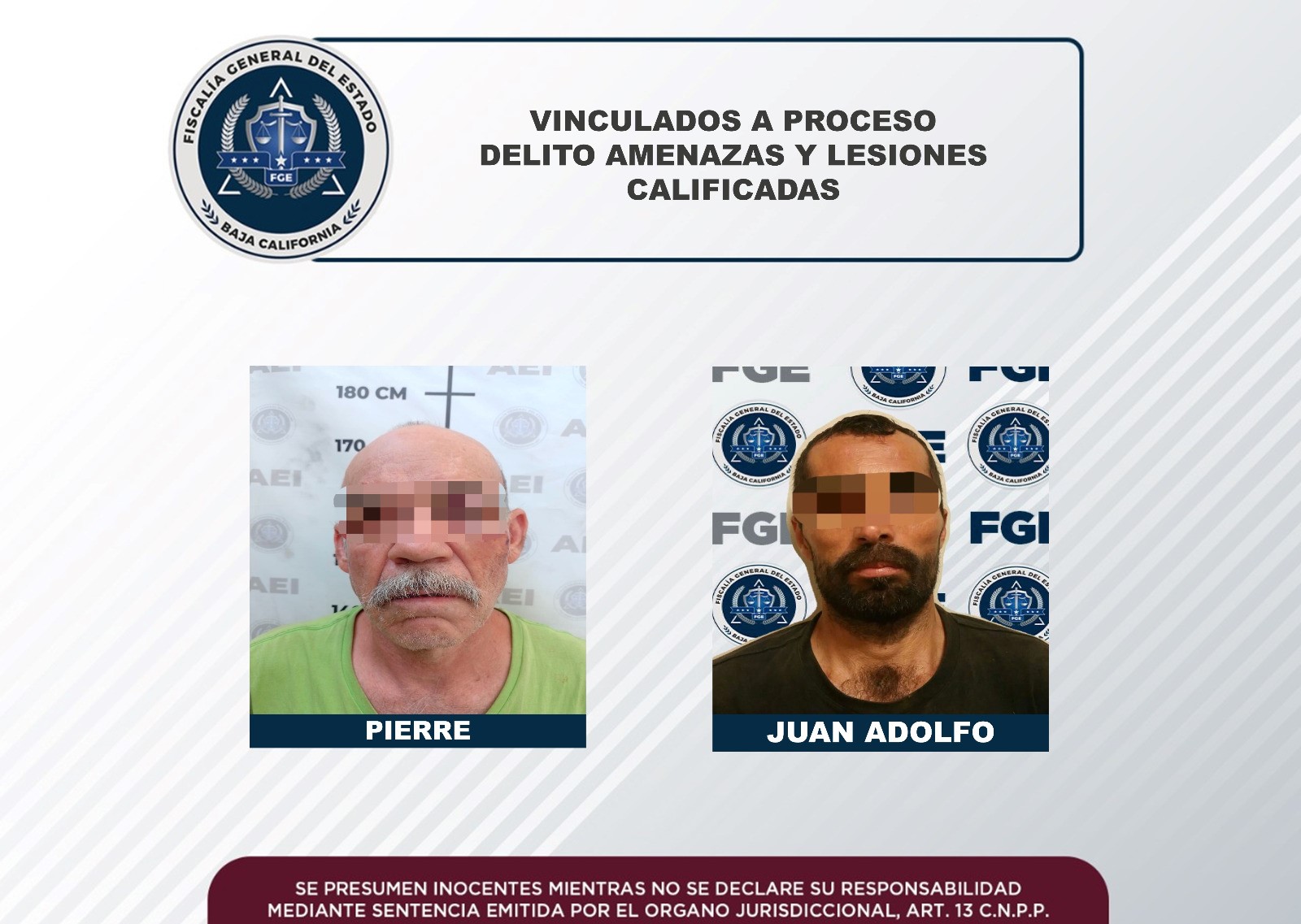 MEXICALI, B.C. La Fiscalía Regional de Mexicali, a través de las Unidades de Investigación con Detenidos Poniente y Unidad Foránea de Guadalupe Victoria, obtuvo la vinculación de acusados por los delitos de amenazas y lesiones calificadas.