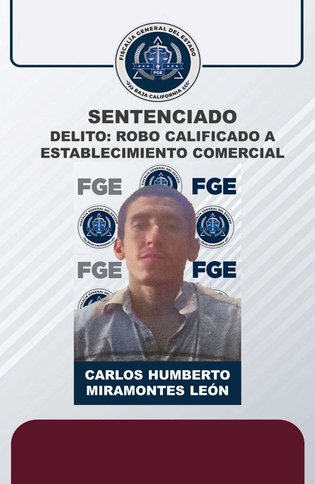 ENSENADA, B.C. La Fiscalía Regional de Ensenada obtuvo sentencia condenatoria en contra de un hombre que cometió robo en un establecimiento comercial ubicado en la colonia Bustamante, hecho por el cual purgará dos años y seis meses de cárcel, sin beneficios libertarios.