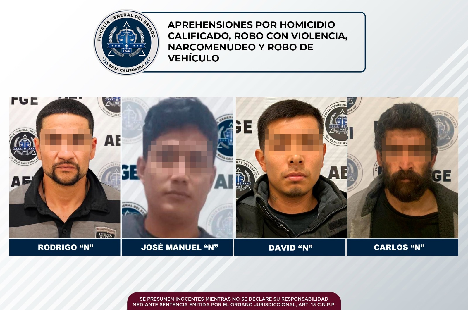 TIJUANA, B.C. La Fiscalía General el Estado cumplimentó, a través de la Unidad de Aprehensiones de la Agencia Estatal de Investigación, cuatro mandatos judiciales, por los delitos de homicidio calificado, robo con violencia, narcomenudeo y robo equiparado de vehículo de motor en la modalidad de posesión.