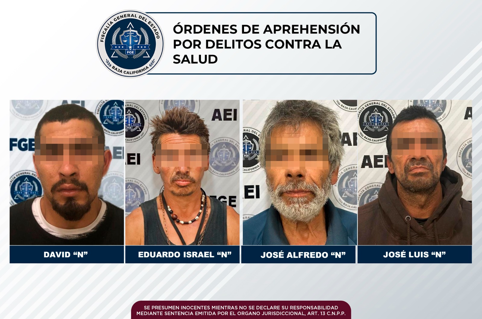 TIJUANA, B.C. Por su probable responsabilidad en delitos contra la salud, a cuatro sujetos se les cumplimentó orden de aprehensión, las cuales fueron otorgadas por jueces de control, a petición del agente del Ministerio Público de la Fiscalía General del Estado.