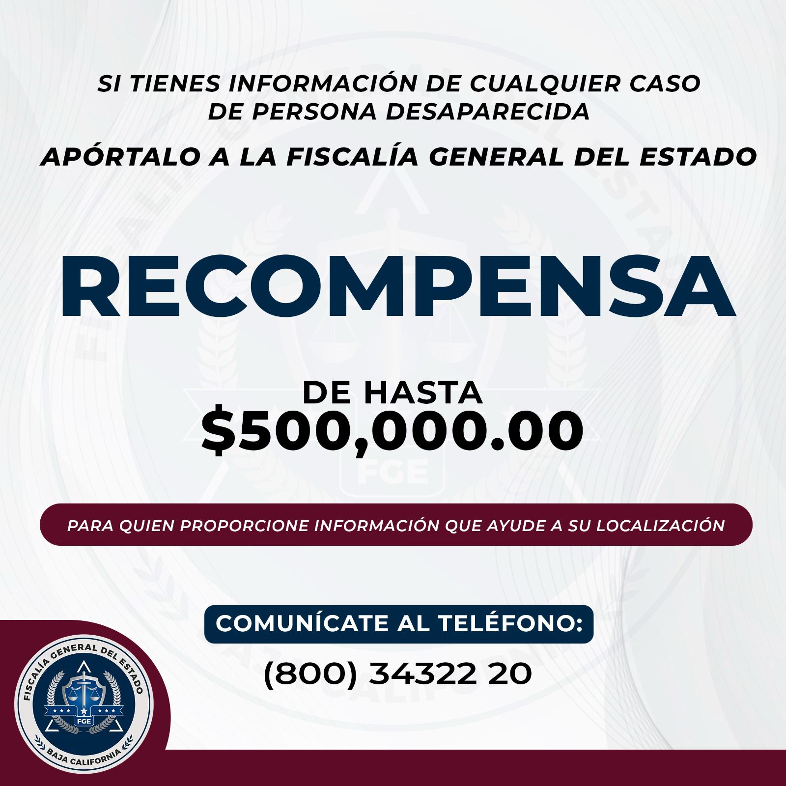 Como parte de los mecanismos que impulsa la FGE que abonen a dar con el paradero de personas, ha dispuesto otorgar la recompensa de hasta 500 mil pesos para todo ciudadano que aporte cualquier información que sea de utilidad para avanzar en algún caso.