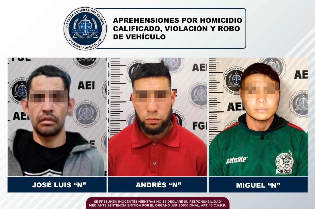 TIJUANA, B.C. La Fiscalía General del Estado, a través de la Agencia Estatal de Investigación, logró la aprehensión de tres imputados, relacionados en diferentes casos en los delitos de homicidio calificado, violación equiparada y robo de vehículo.