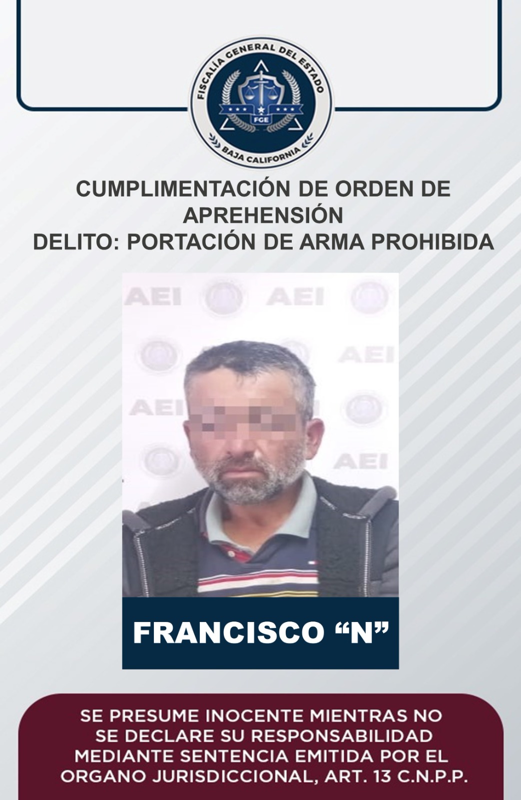 ENSENADA B.C. La Fiscalía General del Estado cumplimentó una orden de aprehensión en contra de Francisco “N”, de 50 años de edad, por el delito de portación de arma prohibida.