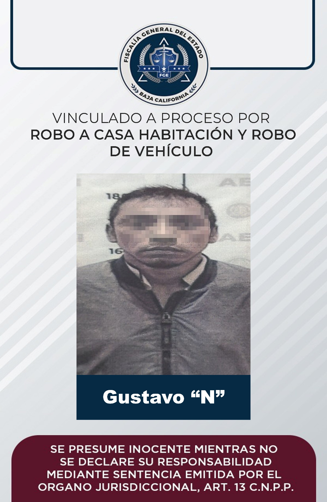 TIJUANA, B.C. Como resultado de acciones de investigación y datos de prueba recabados por la Fiscalía Regional de Tijuana, se obtuvo la vinculación a proceso de Gustavo “N” por la posible comisión de los delitos de robo a casa habitación y robo de vehículo, ambos cometidos con violencia.