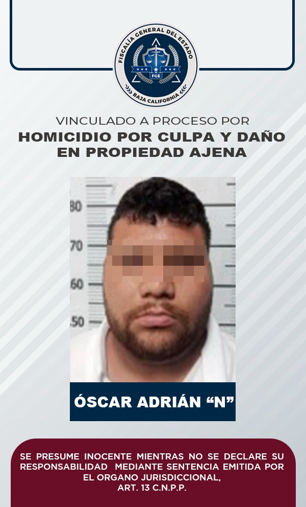 PLAYAS DE ROSARITO, B.C. Por su probable responsabilidad en los delitos de homicidio por culpa y daño en propiedad ajena por culpa, un sujeto que responde al nombre de Óscar Adrián “N”, fue vinculado a proceso, informa la Fiscalía Regional de Playas de Rosarito.