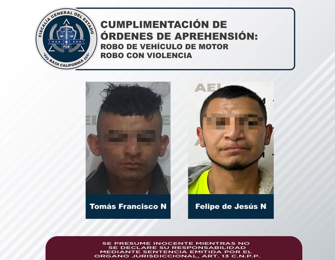 ENSENADA, B.C. La Fiscalía General del Estado (FGE), cumplimentó órdenes de aprehensión en contra de dos presuntos ladrones que eran requeridos por el delito de robo con violencia y robo de vehículo respectivamente.