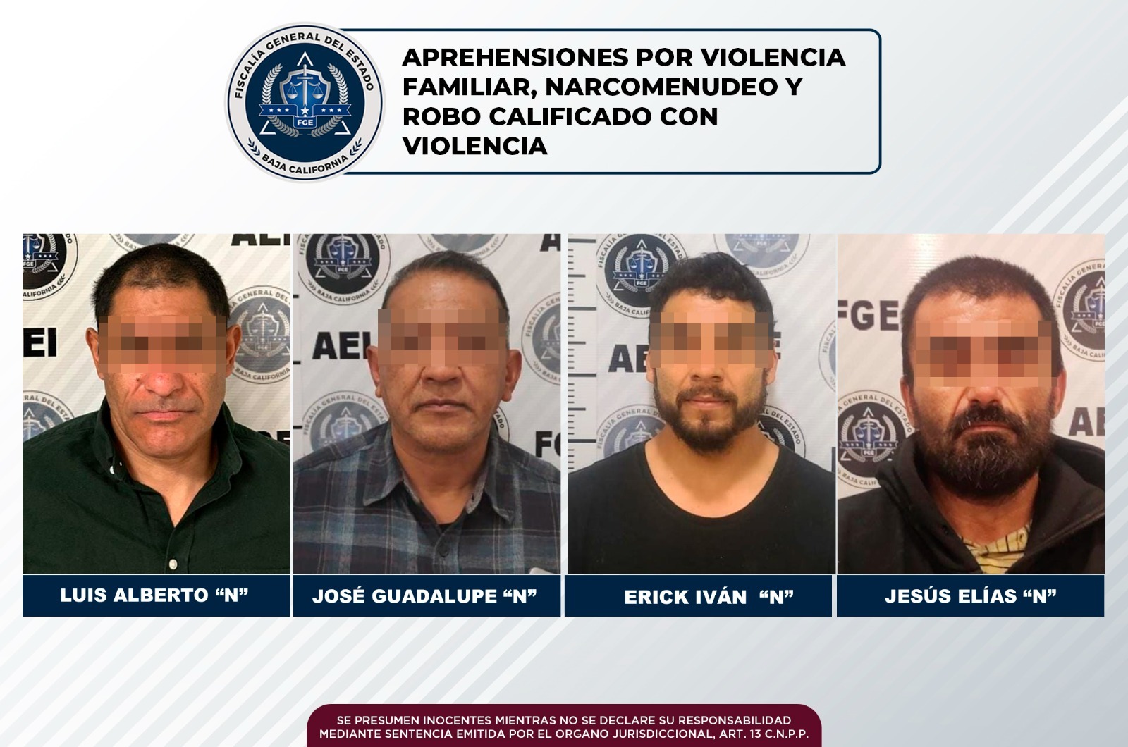 TIJUANA, B.C. Elementos de la Unidad de Aprehensiones de la Fiscalía General del Estado, lograron la detención de cuatro personas, quienes contaban con mandatos judiciales en su contra, en eventos diversos por los delitos de violencia familiar, robo calificado con violencia y narcomenudeo.