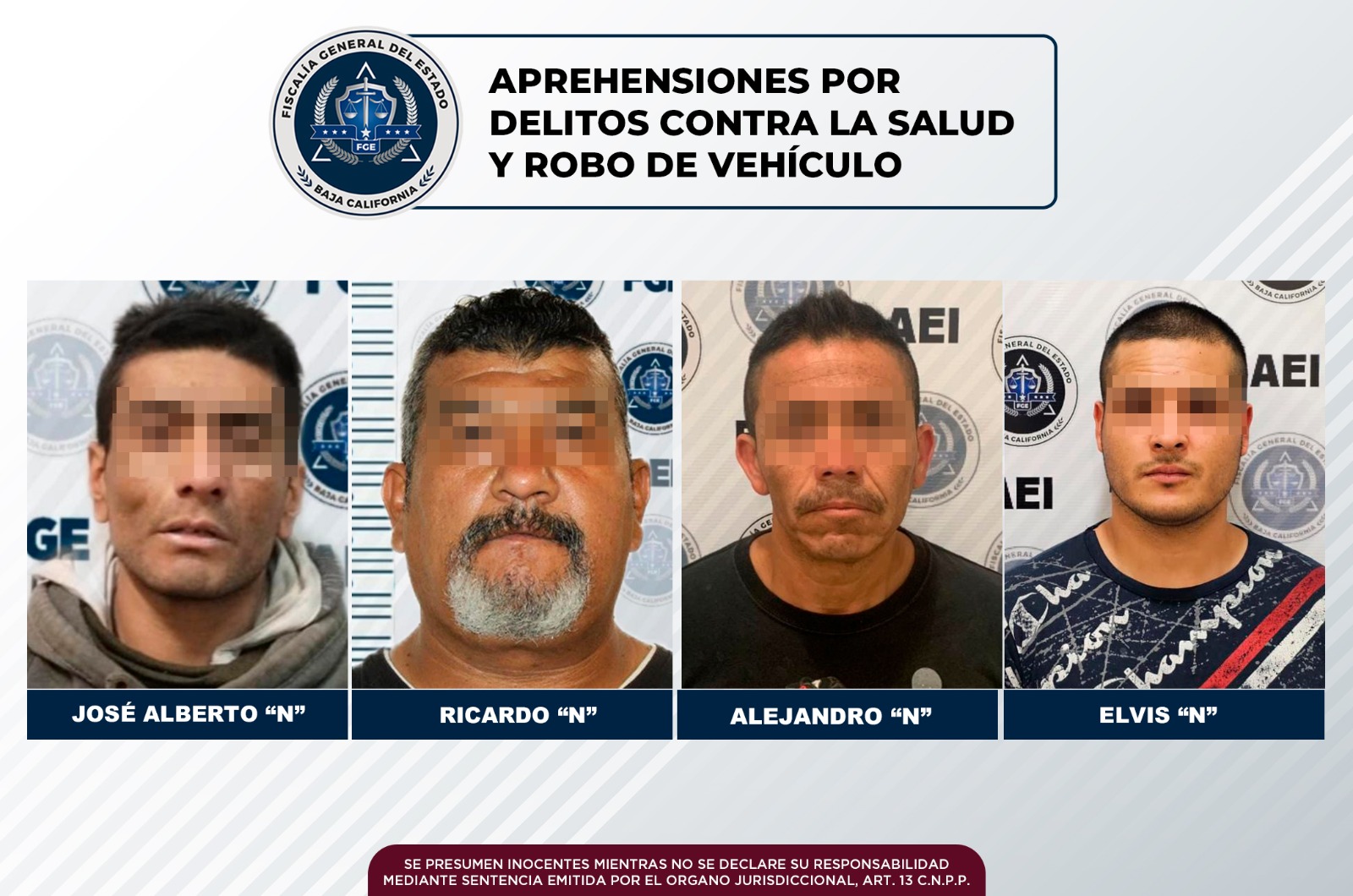 TIJUANA, B.C. Como resultado de acciones de investigación, la Fiscalía General del Estado obtuvo y cumplimentó órdenes de aprehensión por delitos contra la salud y robo de vehículo, en diligencias desarrolladas por la Agencia Estatal de Investigación (AEI).