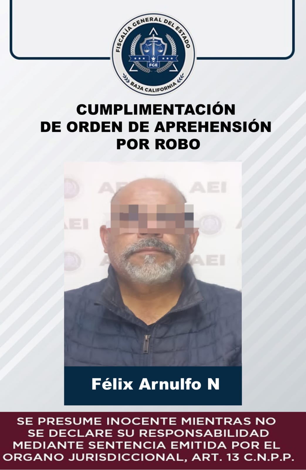 ENSENADA, B.C. Tras cumplimentar una orden de cateo en la colonia Benito Juárez, agentes de la Fiscalía General del Estado lograron la detención de Félix Arnulfo “N”, quien era requerido por la ley por la presunta comisión de robo dentro de un establecimiento.