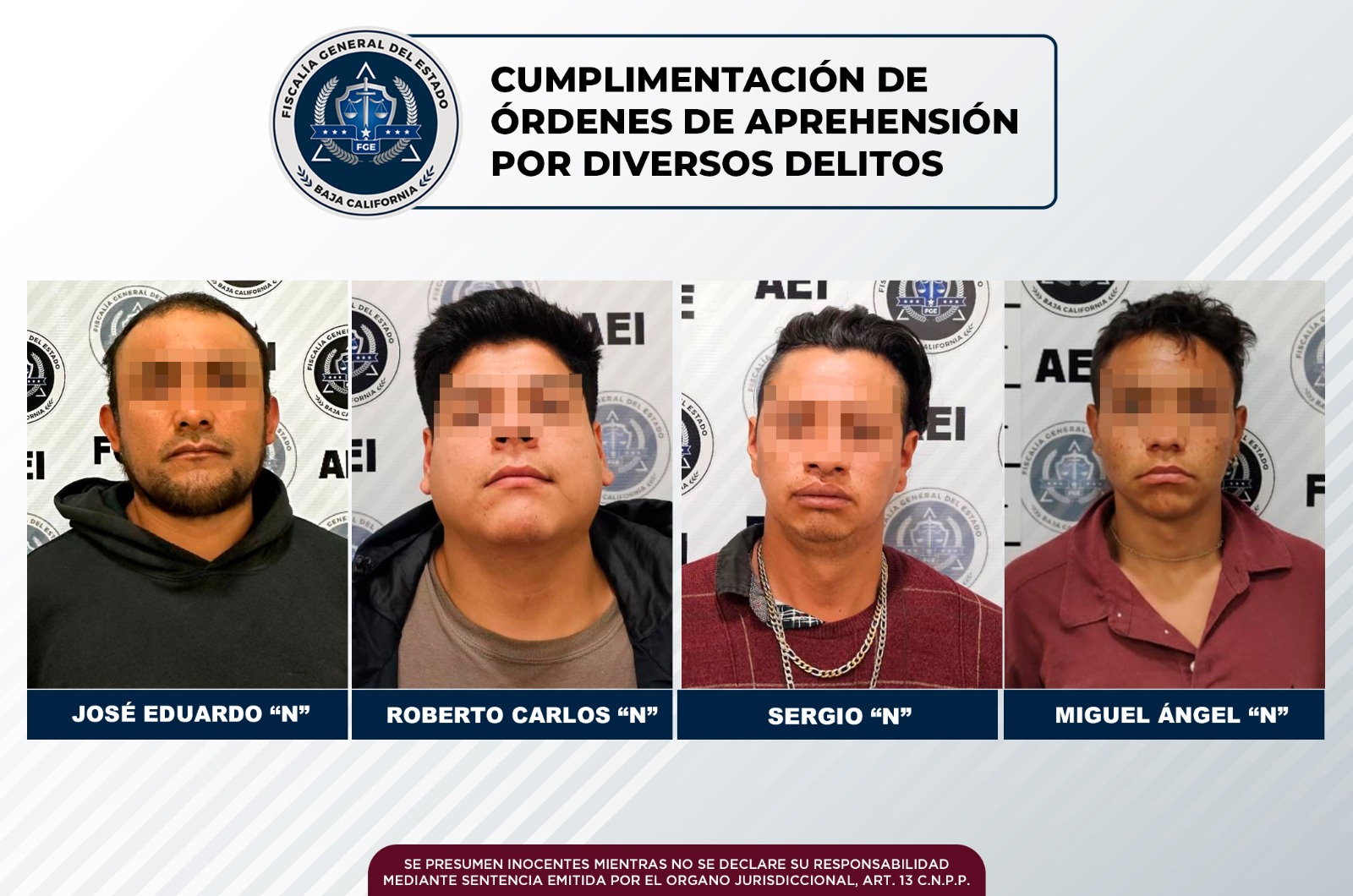 TIJUANA, B.C. Acciones de investigación por parte de elementos de la Fiscalía General del Estado, derivado en la detención de cuatro sujetos que tenían orden de aprehensión activa por diversos delitos y quienes ya se encuentran a disposición de jueces de control.