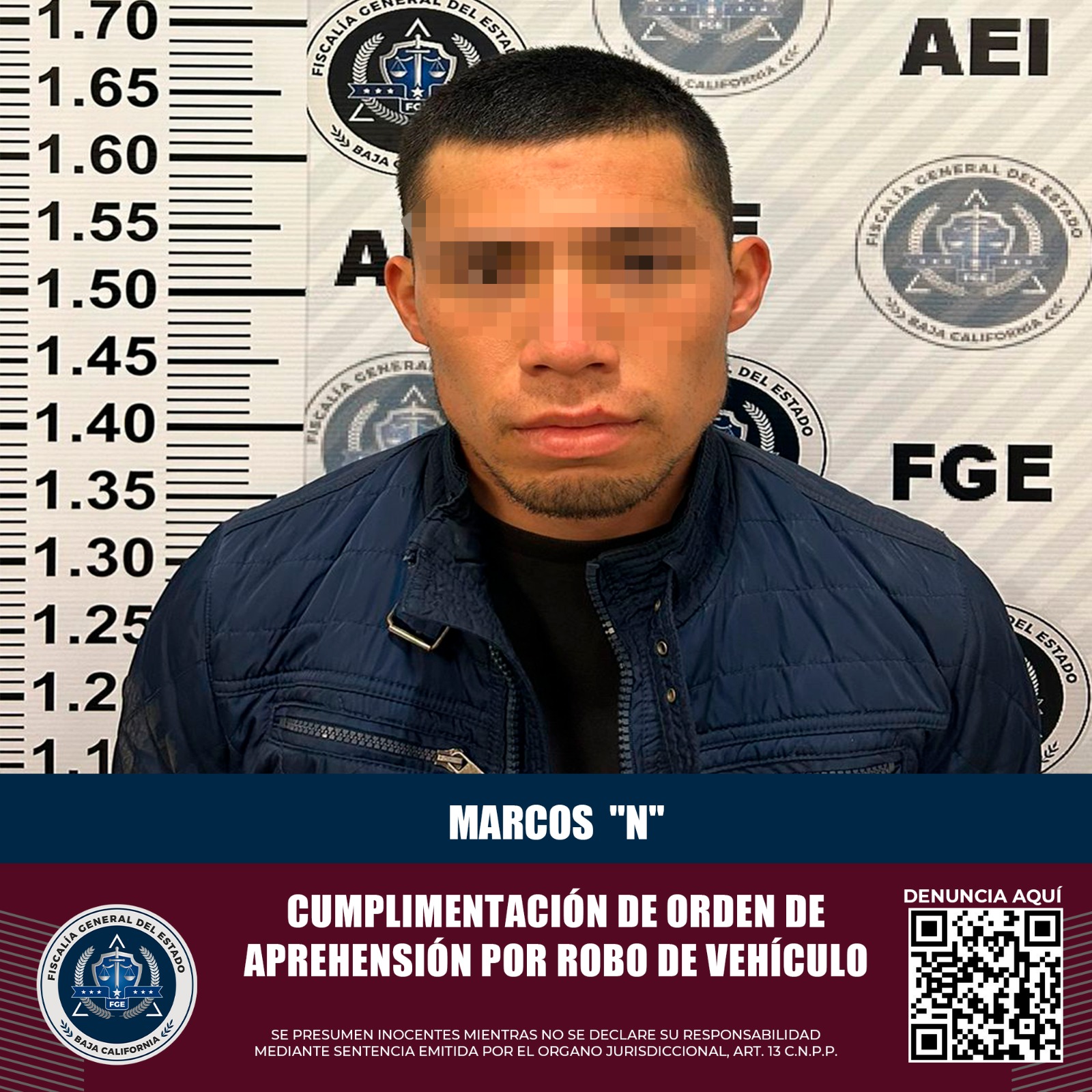 PLAYAS DE ROSARITO, B.C. Por su presunta comisión en el delito que la ley señala como robo equiparado de vehículo de motor en su modalidad de uso de vehículo de motor robado, el de nombre Marcos “N”, fue aprehendido tras labor desarrollada por efectivos de la Agencia Estatal de Investigación (AEI) de la Fiscalía General del Estado.
