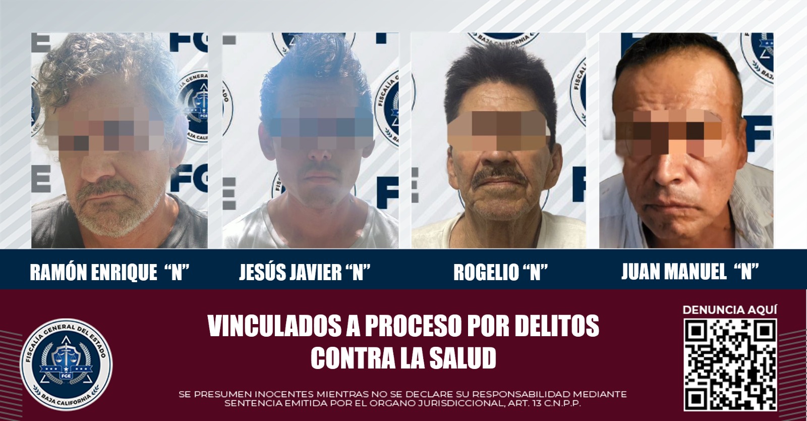 MEXICALI, B.C. La Fiscalía General del Estado (FGE), a través del trabajo realizar por la Fiscalía Especializada en Narcomenudeo, zona Mexicali, obtuvo la vinculación a proceso de cuatro sujetos relacionados en la venta y distribución de droga.