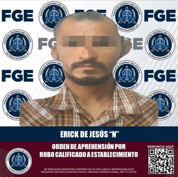 ENSENADA, B.C. La Fiscalía General del Estado (FGE), a través de la Agencia Estatal de Investigación (AEI), cumplimentó una orden de aprehensión en contra de Erick de Jesús “N”, por el delito de robo calificado cometido a establecimiento abierto al público.