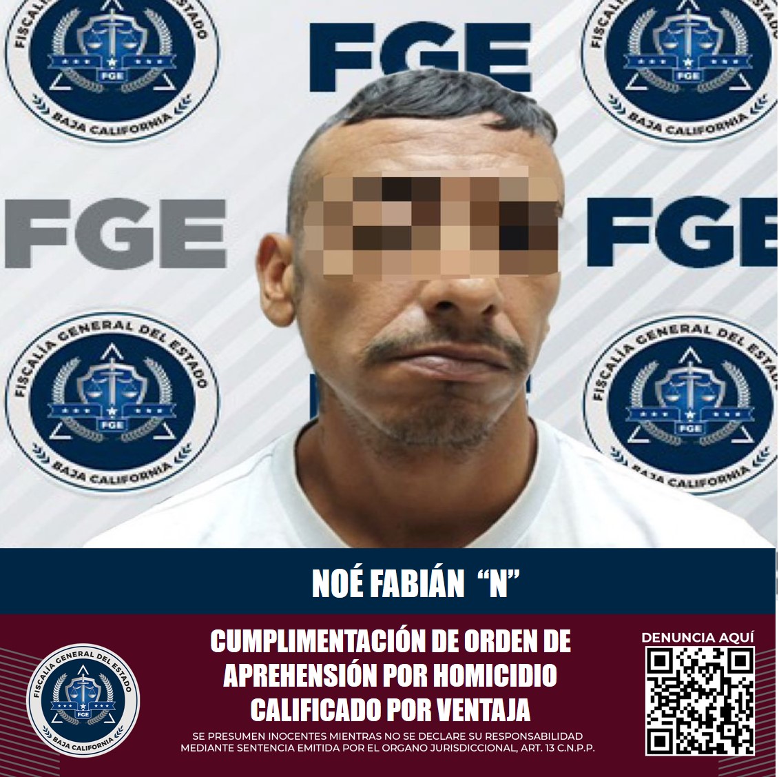 MEXICALI, B.C. El Grupo Especializado en Aprehensiones, de la Fiscalía General de Baja California, cumplimentó un mandato judicial en contra de Noé Fabián “N”, por el delito de homicidio calificado por ventaja.