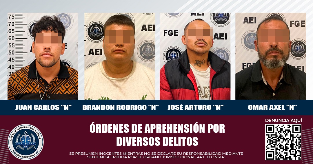 TIJUANA, B.C. Cuatro hombres quedaron a disposición de jueces de control, una vez que la Fiscalía General del Estado, a través de elementos de la Agencia Estatal de investigación (AEI) les cumplimentara orden de aprehensión por diversos delitos.