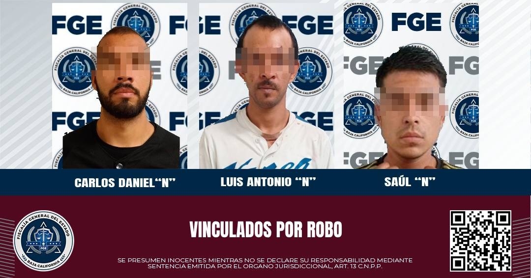 MEXICALI, B.C. Tres personas presuntamente relacionadas en robos con violencia, fueron vinculadas a proceso, con base a los elementos de prueba presentados por la Fiscalía Regional de Mexicali, a través de la Unidad de investigación de Robos Poniente.