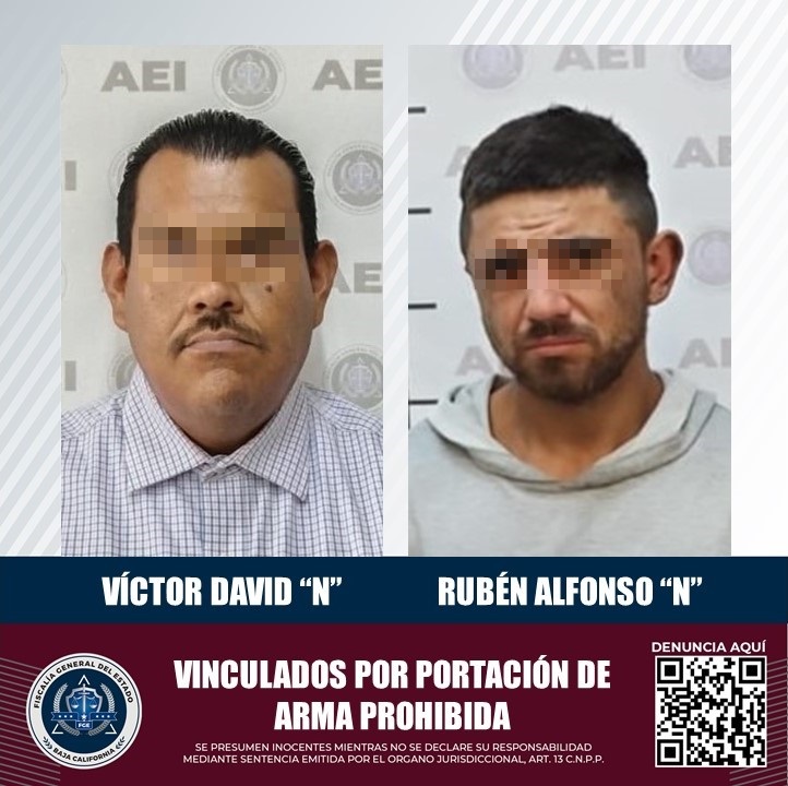 ENSENADA, B.C. La Fiscalía Regional de Ensenada, a través del Ministerio Público, presentó cargos por el delito de portación de arma prohibida contra dos sujetos detenidos en distintas zonas del municipio.