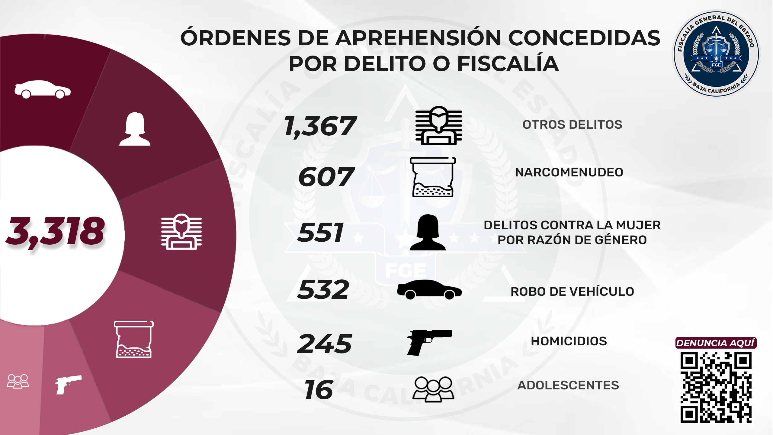 Bajo el liderazgo del Fiscal Ricardo Carpio, ha sido posible, de enero al 13 de junio del año en curso, la cumplimentación de 3 mil 318 mandamientos judiciales por diversos delitos, cuyo desglose es el siguiente: narcomenudeo 607, delitos contra las mujeres por razón de género 551, robo de vehículo 532, homicidios 245, adolescentes 16 y otros delitos 1,367.