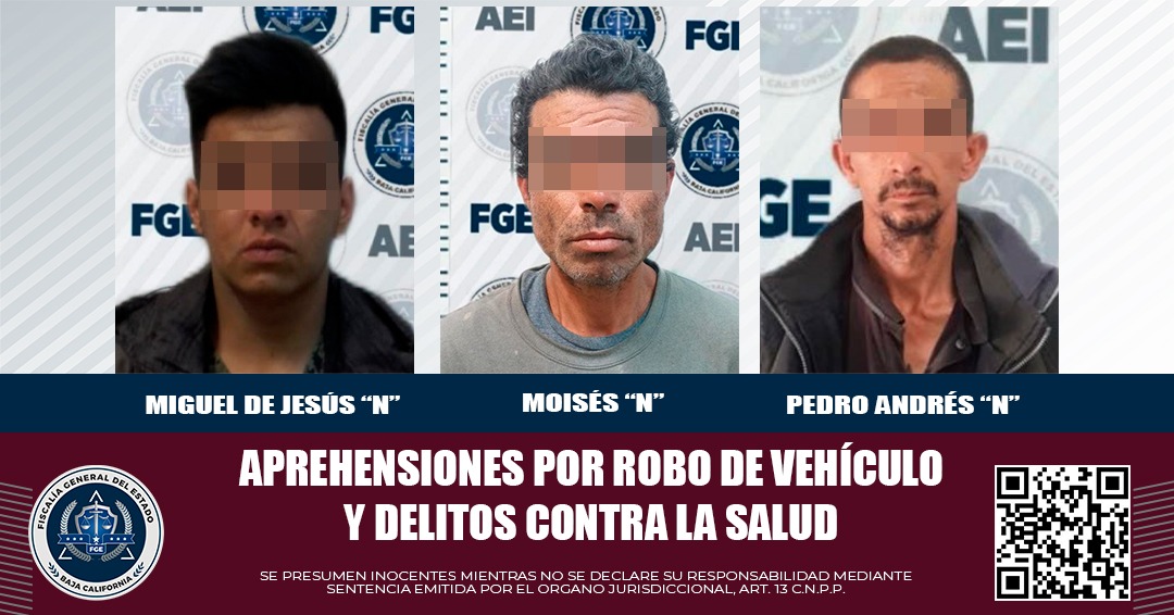 TIJUANA, B.C. Tres sujetos que tenían mandamientos judiciales activos fueron turnados ante jueces de control, una vez que la Fiscalía General del Estado a través de la Agencia Estatal de Investigación (AEI) les cumplimentara la orden de aprehensión correspondiente, en dos casos por robo de vehículo y en otro por delitos contra la salud.