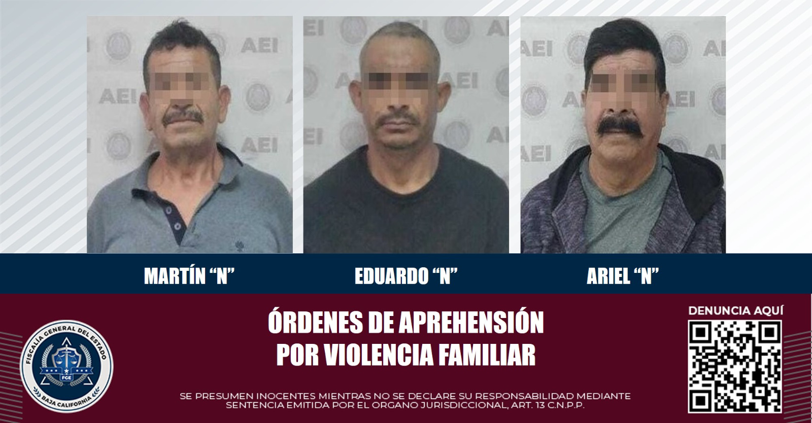 TECATE, B.C. En días recientes, elementos de la Agencia Estatal de Investigación (AEI), de la Fiscalía General del Estado, cumplimentaron tres órdenes de aprehensión por el delito de violencia familiar. Los detenidos han quedado a disposición de la autoridad correspondiente.