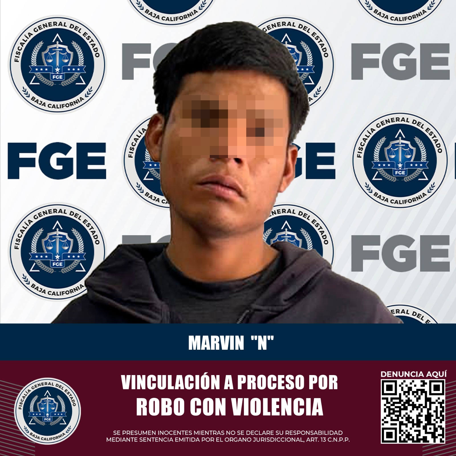 TIJUANA, B.C. Con base en datos de prueba presentados por el agente del Ministerio Público de la Fiscalía Regional de Tijuana ante un Juez de Control, se obtuvo la vinculación a proceso con medida cautelar de prisión preventiva de Marvin “N”, quien es probable responsable del delito de robo con violencia.
