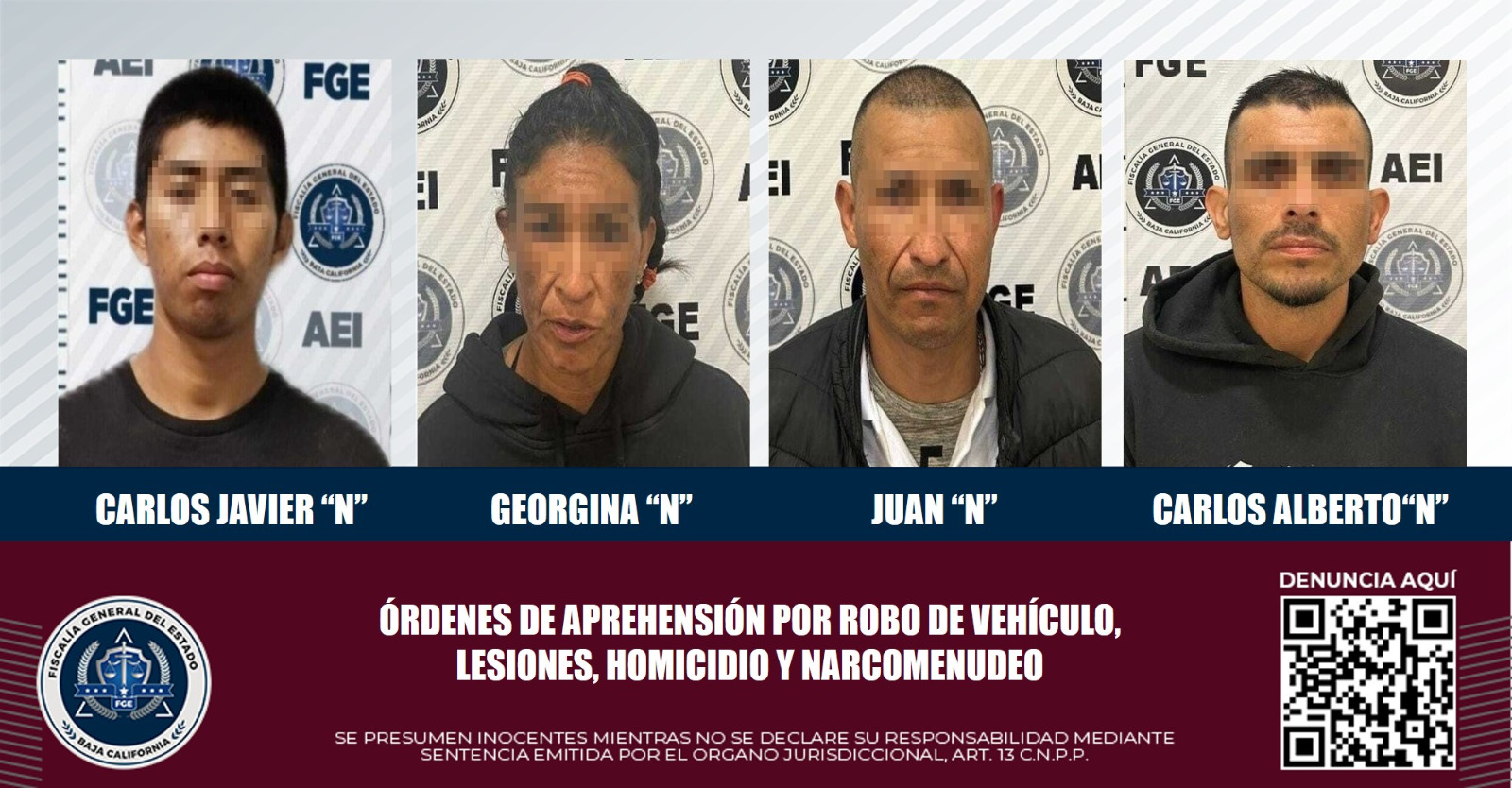 TIJUANA, B.C. Agentes estatales de investigación de la Fiscalía General del Estado, cumplimentaron cuatro mandamientos judiciales al mismo número de personas, mismas que eran requeridas por jueces de control y que ya se encuentran a disposición de los mismos.