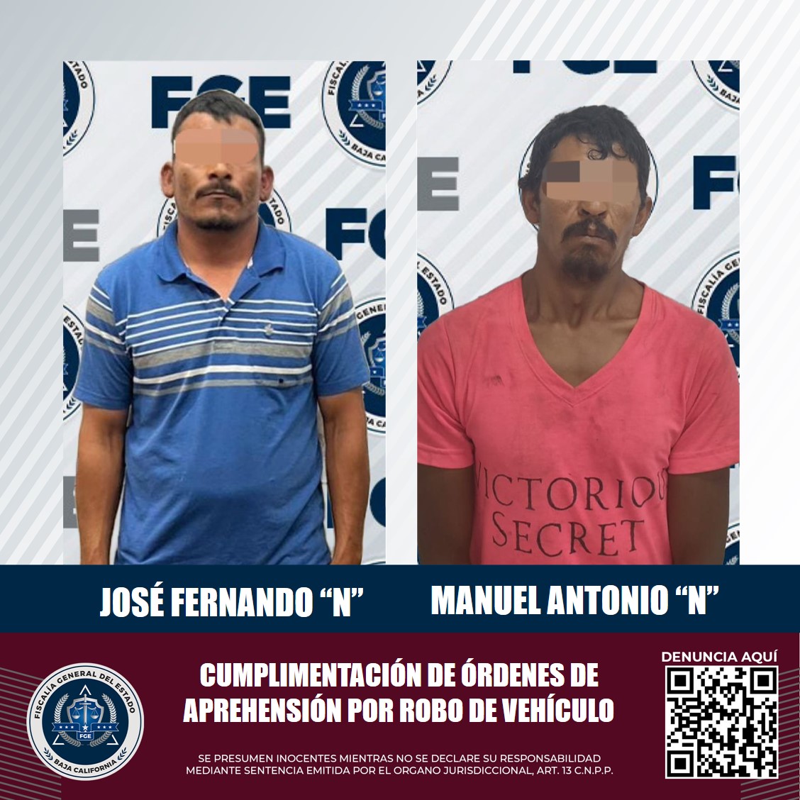 MEXICALI, B.C. Agentes Estatales de Investigación adscritos a la Fiscalía Regional de Mexicali, lograron la detención de dos individuos que contaban con órdenes de aprehensión por presuntamente cometer el delito de robo de vehículo en grado de tentativa y robo equiparado de vehículo de motor en la modalidad de desmantelar vehículo de motor robado.
