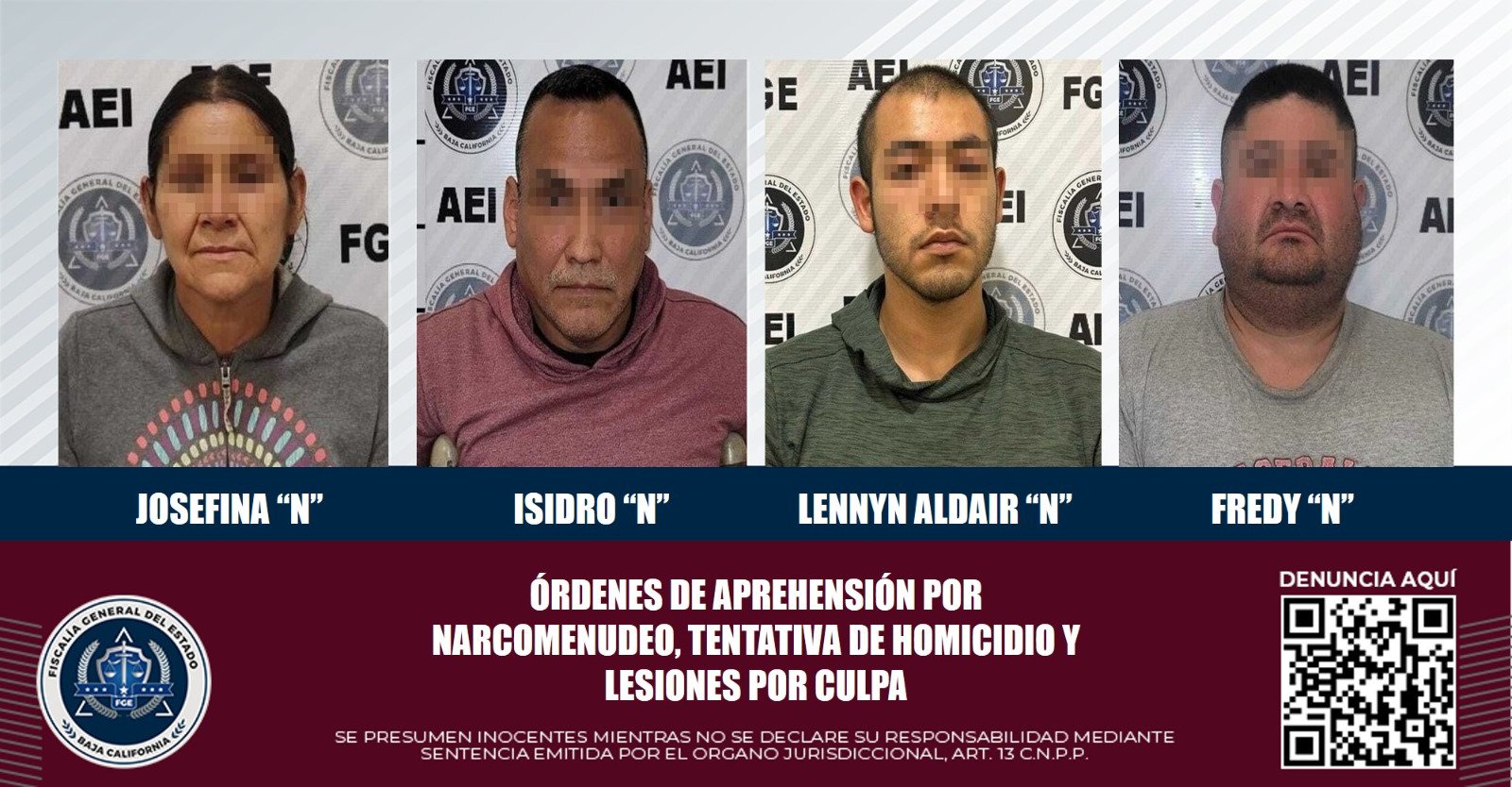 TIJUANA, B.C. La Fiscalía General del Estado, a través de elementos de la Agencia Estatal de Investigación, cumplimentó cuatro mandamientos judiciales por diversos delitos. Las personas detenidas fueron puestas a disposición de la autoridad jurisdiccional correspondiente.