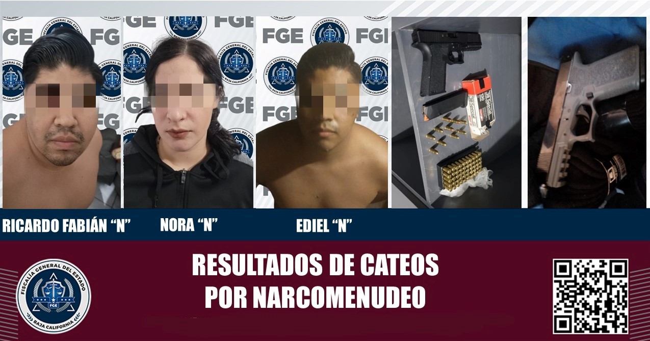 La FGE asegura a tres personas en cateos por narcomenudeo, y decomisa armas y droga